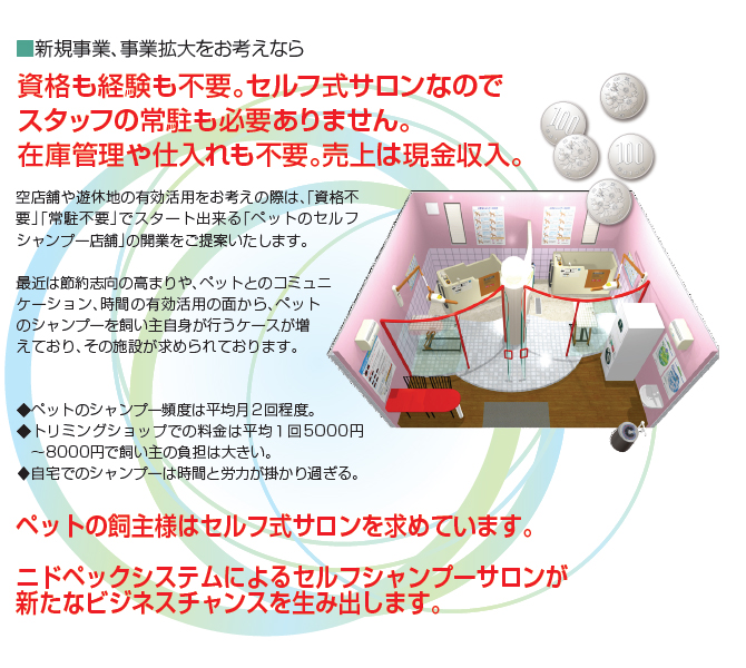 ペットが喜ぶセルフ式ペットシャワーサロン用機器の開発・販売。